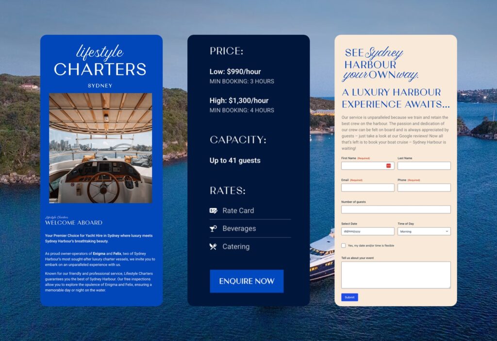 Lifestyle Charters operates in Sydney’s competitive charter market, where most customers begin by searching for yacht hire, boat charters, or harbour experiences online. In 2023, the website had limited organic reach and appeared mainly for branded searches and specific vessel names. As a result, the business was being found mostly by people who already knew the brand, not by customers actively looking to book a charter.